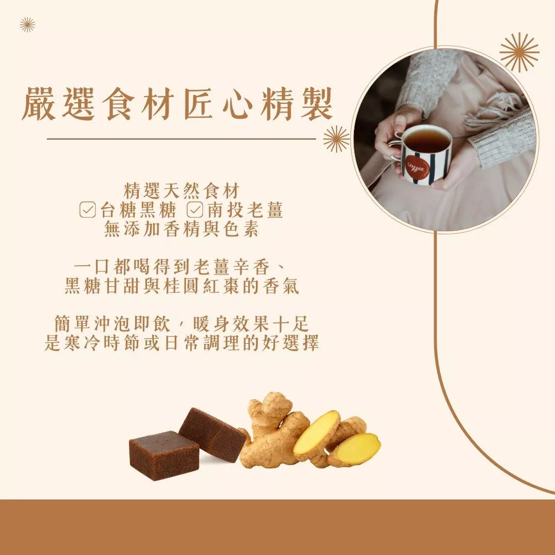 每一口都喝得到老薑辛香與黑糖濃甜,暖身效果十足,無添加香精與色素,簡單沖泡即飲,是寒冷時節或日常調理的好選擇。