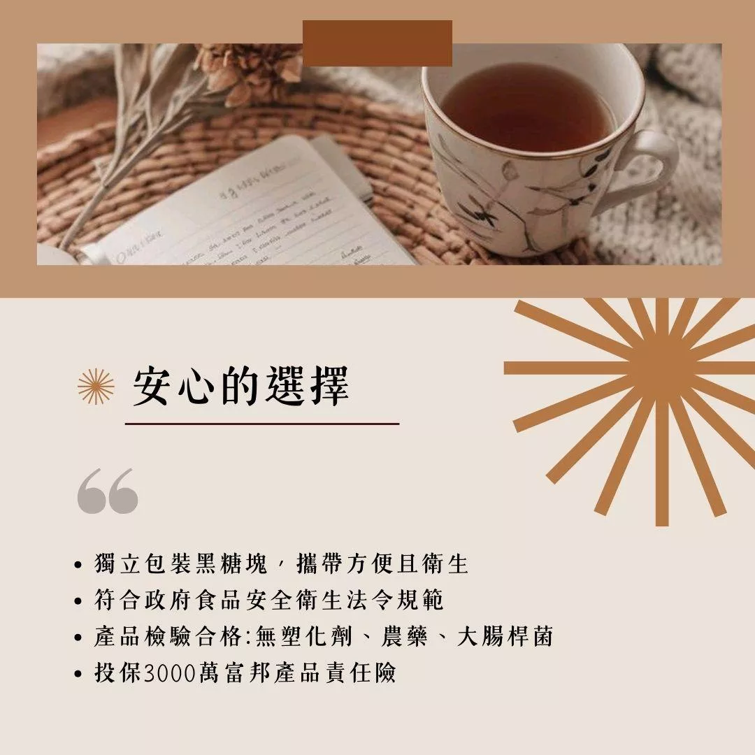 採用台糖黑糖,並堅持使用天然的食材(南投老薑),層層把關的手工生產,符合政府食品安全衛生的法令規範,真正做到保障消費者的食用安全。