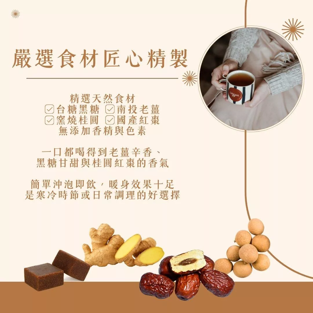 - 成份:黑糖、蔗糖、紅棗、桂圓肉、老薑(依實品中文標籤為準)